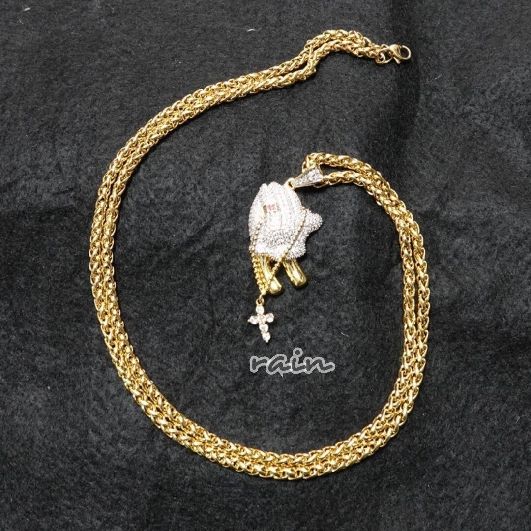 祈りを捧げるプレイヤーハンドをモチーフにしたペンダントに、スイングするロザリオ。